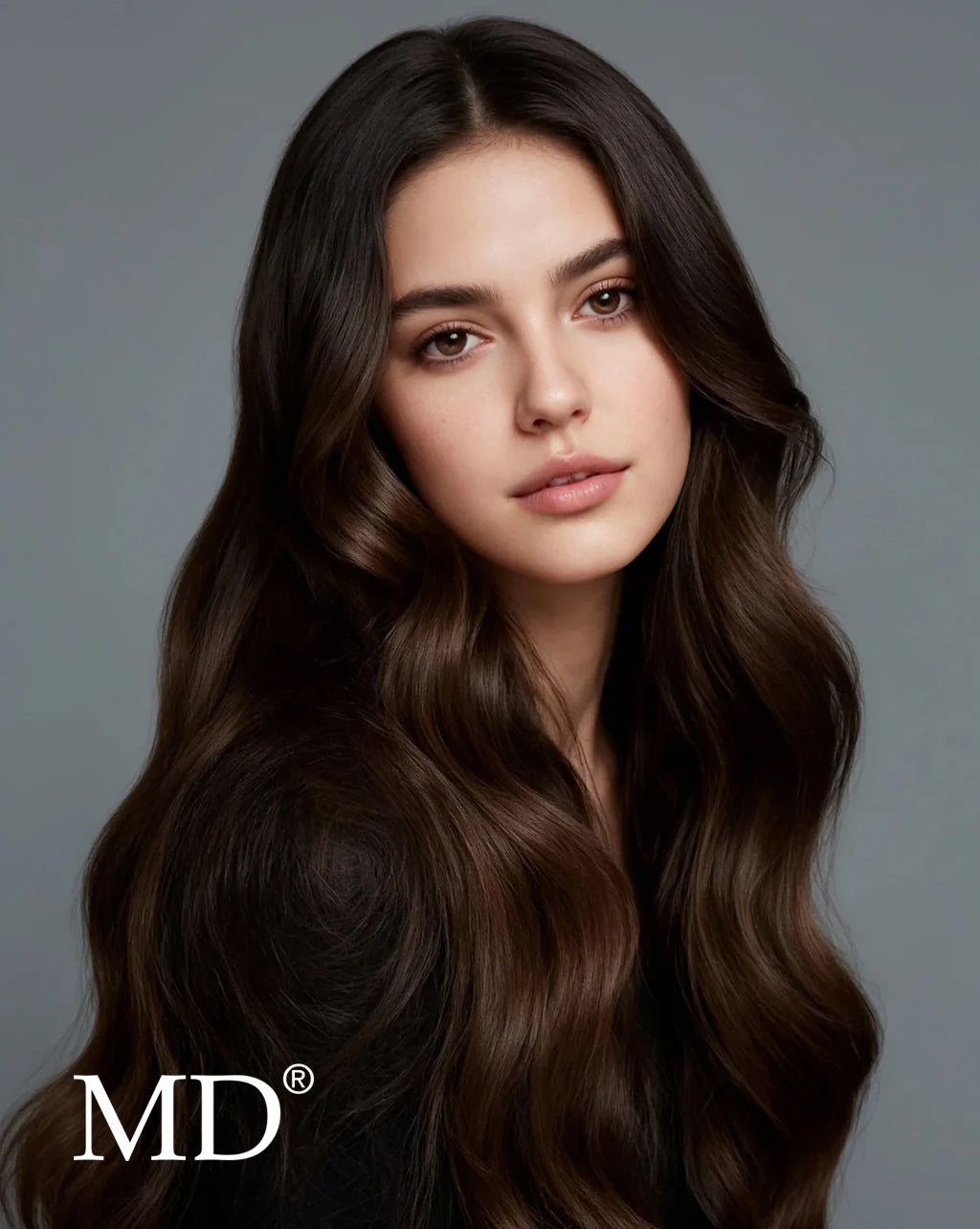 Photo of woman with long, thick, flowing hair showcasing benefits of MD® Hair Revitalizing Treatment – detoxifies scalp, thickens hair, soothes scalp, infused with natural essential oils, and lauryl sulfate free
